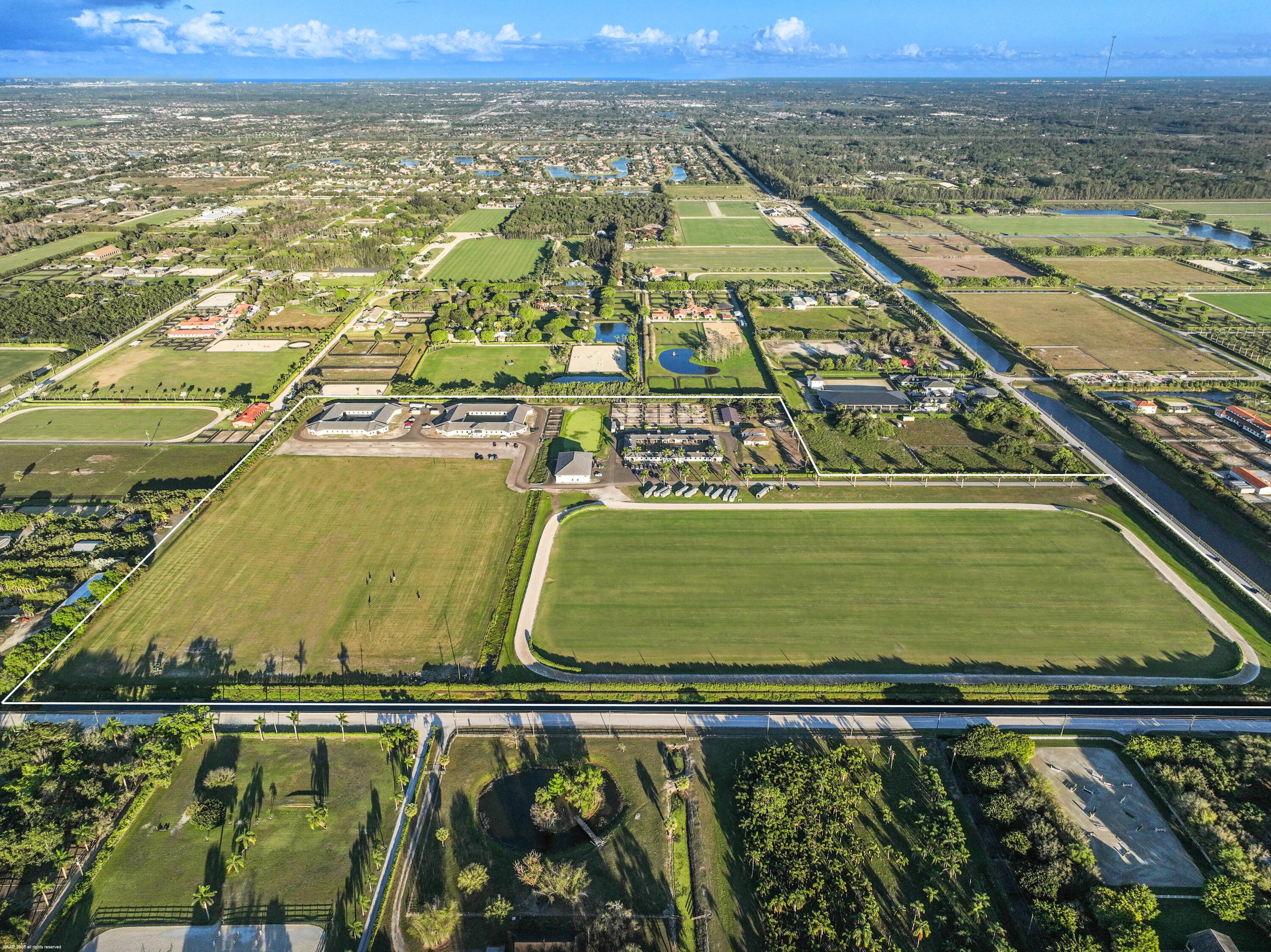Reduced $7,500,000. One of a kind opportunity to own a 46.96 acre equestrian facility in a prime Wellington location on a paved road and with no homeowner's association. The property boasts 4 stables, totaling175 stalls, full size polo field with exercise track, a second stick & ball practice field, maintenance garage and two staff houses. Two new show barns were built in 2024, one with 52 stalls & the other with 59, it also features a 2nd floor viewing room with balcony overlooking the polo fields. The original courtyard barn holds 48 horses and the over flow barn has 16 stalls. The staff houses each have 4BR & 4Bths. The property is comprised of multiple parcels which could lend itself to future subdivision. This farm has unlimited potential for all equestrian disciplines. A must see!