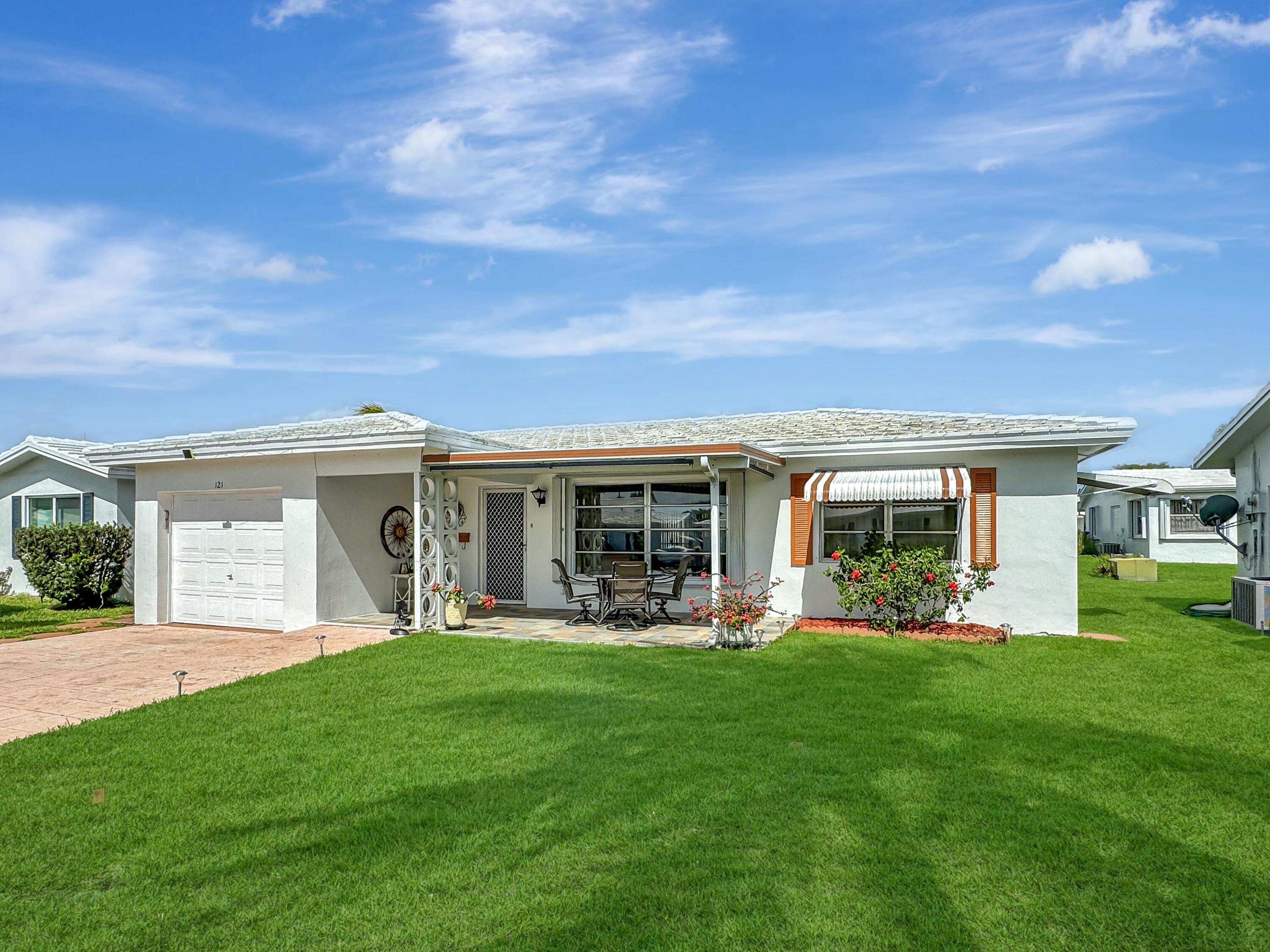 Spacious home in Leisureville. Discover this magnificent concrete home model with land, located in a 55+ community in Leisureville. With a roof redone in 2019, this home offers a garage, parking space for up to 4 cars, and a large covered sunny patio, perfect for relaxation. A large kitchen and an open living room leading into the Florida room create a bright and welcoming living space. This community provides access to a 9 hole (Par 3) golf course, two clubhouses, two heated pools, a sauna, billiards, ptanque, and much more. Minimal fees of $298.00 per month cover water, lawn maintenance, herbicides, as well as exterior house painting and roof maintenance. Only 15 minutes from Florida's beautiful beaches. Don't miss this unique opportunity !