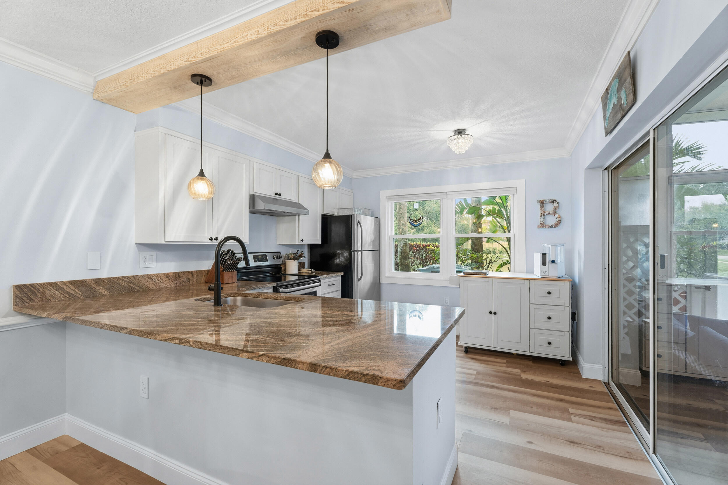 This renovated townhouse has been thoughtfully updated from top to bottom with a fresh, coastal feel. Laminate flooring flows throughout, leading into a bright, open kitchen with quartz countertops, s