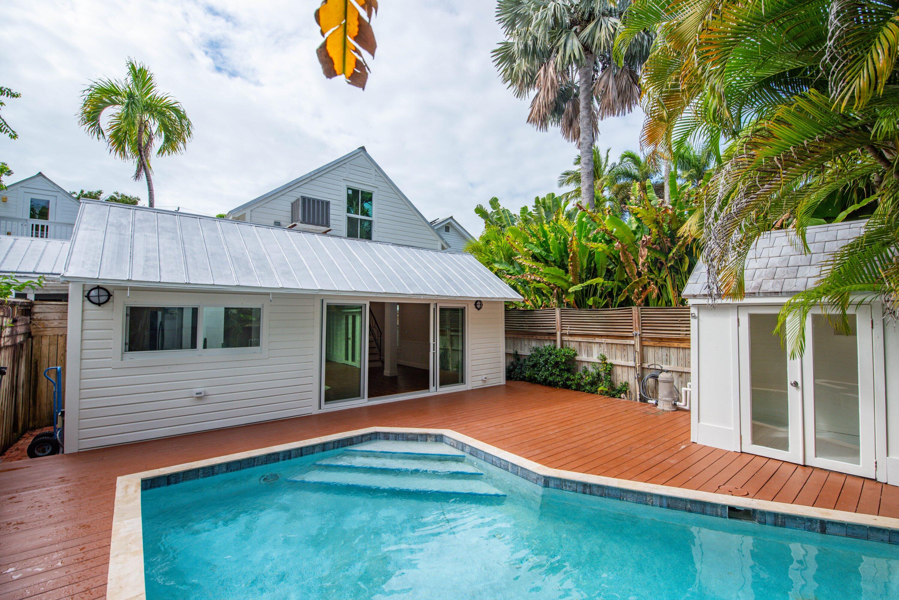 Charming remodeled 1929 Old Town Key West home on iconic Margaret Street, offering privacy, new impact windows & doors, flooring and timeless island feel. Set back from the street, this three bedroom, two bath residence feels like a peaceful retreat while remaining close to Duval Street and the historic seaport. The outdoor living space features a beautiful pool and spa area surrounded by a spacious deck, perfect for relaxing and entertaining. A small separate pool house with a half bath adds convenience and flexibility (not included in square footage). A rare opportunity to enjoy classic Key West charm with exceptional outdoor living in a prime location.