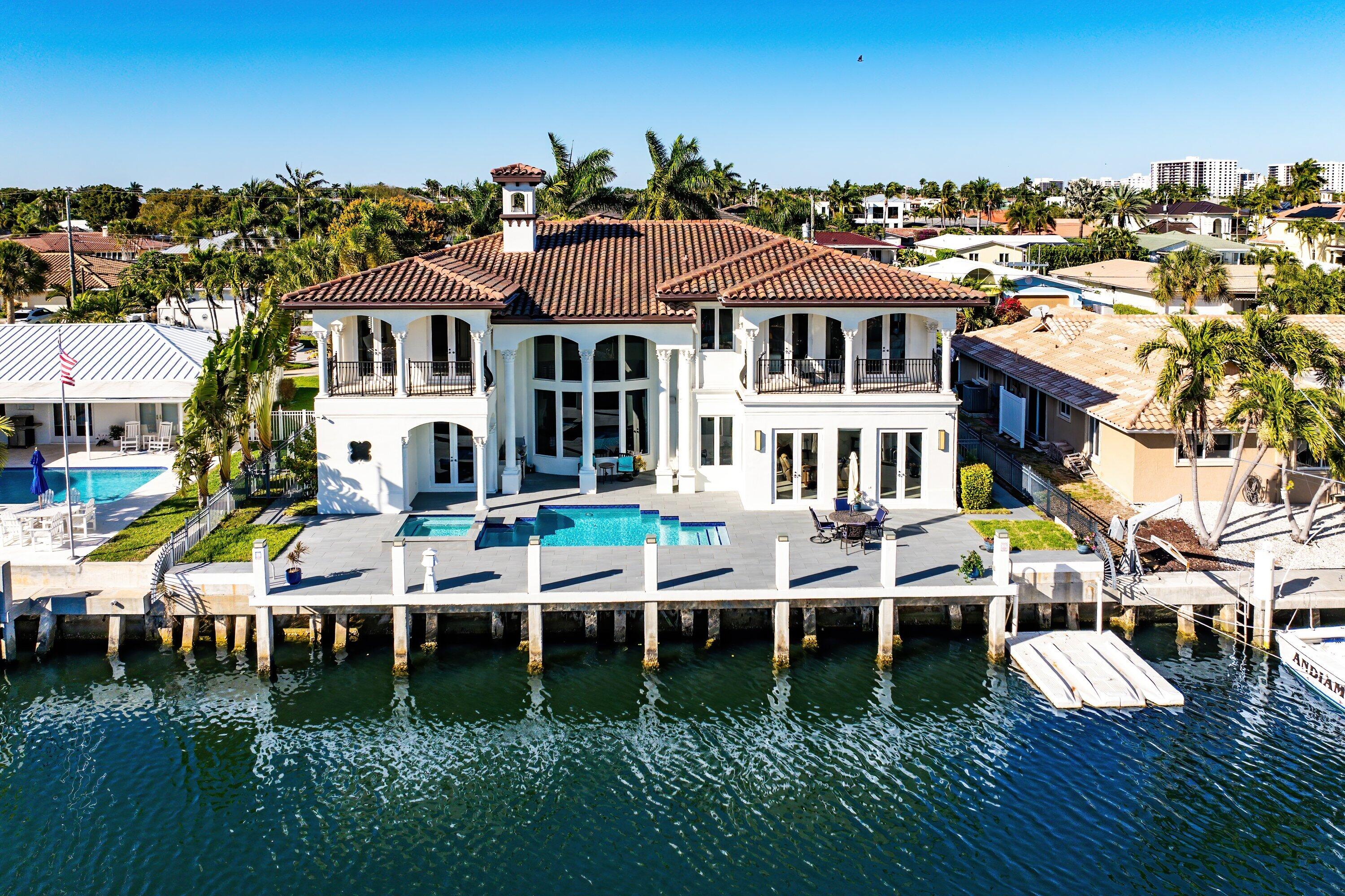 A Masterpiece of Gated Mediterranean Waterfront Living in Boca Raton Commanding a premier position just off the Intracoastal with coveted southern exposure, this magnificent deepwater Mediterranean estate defines refined coastal luxury. Set within a private gated enclave and fronting a wide turning basin, the residence offers 85 feet of prime dockage, delivering an exceptional yachting lifestyle for discerning boaters. This custom built estate showcases five expansive bedroom suites, 4.5 baths, a stately library, and four walk out balconies, all executed with uncompromising craftsmanship and timeless elegance. Marble floors flow throughout the main living areas and ascend the dramatic wrought iron grand staircase, creating a seamless sense of grandeur. The grand living room makes a striking statement with a floor to ceiling stone, wood burning fireplace and elegant bay windows framing serene water and pool views. Designed for sophisticated entertaining, the resort style outdoor oasis features a spacious pool, spa, and fully equipped summer kitchen with custom gas grill perfect for alfresco gatherings beneath the Florida sun. At the heart of the home, the show stopping chef's kitchen is a culinary masterpiece, appointed with top tier appliances including a Sub Zero refrigerator, Thermador gas cooktop, Bosch dishwasher, and double ovens, anchored by an oversized granite island with prep sink equal parts functional and stunning. The luxurious primary suite is a private sanctuary, offering a generous bedroom, private balcony, morning bar, and a newly reimagined spa inspired bath designed for pure indulgence. Additional living spaces include an elegant library and multiple balconies, ideal for savoring gentle coastal breezes and golden sunsets. Impact resistant windows and French doors provide security and peace of mind, while a 2017 roof enhances long term value and durability. With exceptional southern exposure, premier water frontage, yacht ready dockage, and an elite Boca Raton location, this extraordinary estate represents the pinnacle of waterfront living.